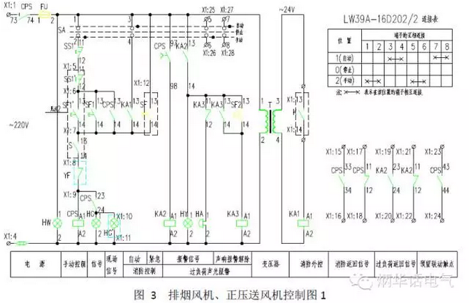 图3是排烟风机和正压送风机控制图,其主回路参见图1b,为CPS方案,适合于交流380V单台消防排烟风机或正压送风机的现场控制或两地控制,过载保护只报警,风口(或风阀)上的微动开关直接与风机联动,消防联动模块提供无源动合触点,当消防系统提供有源触点时,取消变压器T。只有现场控制时,取消SS1'、SF1'、S、HG'并将X1:5与X1:6短接,X1:6与X1:7断开,X1:7与X1:8短接,X1:10与X1:11断开。图中CPS包含线圈、过载保护触点,动合触点、动断触点。用于正压送风机控制时,将X1:8与X1:9短接。