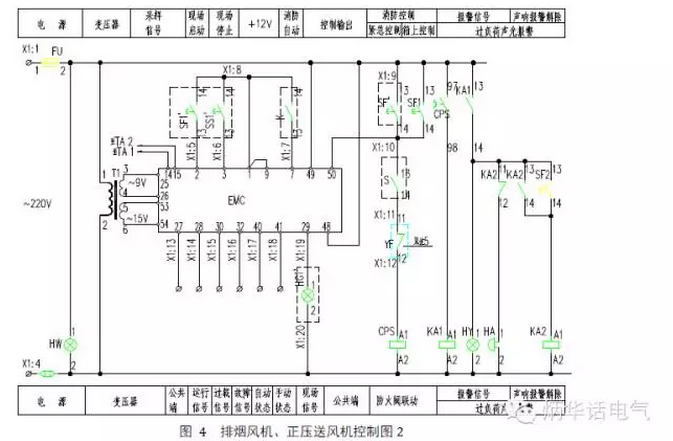 图4是排烟风机和正压送风机另一个控制方案,适合于交流380V单台消防排烟风机或正压送风机的现场控制或两地控制,控制电源为交流220V,过载只报警不作用于断电,风口(或风阀)上的微动开关直接与风机联动,消防联动模块提供无源动合触点,当消防系统提供有源触点时,取消变压器T。只有控制箱上控制时,取消SS1'、SF1'、S、HG1'。图中CPS包含线圈、过载保护触点、动合触点、动断触点。控制器EMC是风机专用控制模块,其面板上有风机的启停控制及相关信号,详见《常用电机控制电路图》10D303-2相关页码。当本图用于正压送风机控制时,将X1:11与X1:12短接。